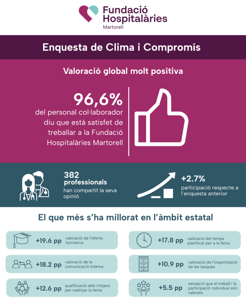 La Fundació Hospitalàries Martorell ha obtingut uns resultats excel·lents en l’última enquesta de clima laboral, consolidant una tendència clara de millora tant en participació com en satisfacció global del personal col·laborador.