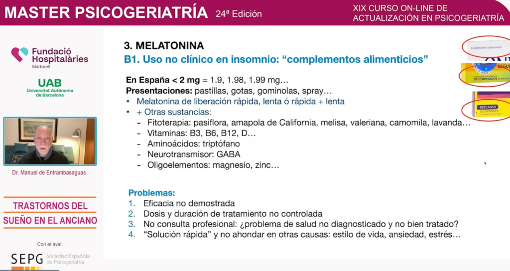 L’aportació del Dr. Entrambasaguas es va emmarcar en una jornada d’alt nivell acadèmic presentada pel Dr. Diego Palao (UAB), el Dr. Carles Franquelo i el Dr. Manel Sánchez (Fundació Hospitalàries Martorell). La sessió es va iniciar amb la conferència inaugural del Dr. Juan Antonio Madrid (Universitat de Múrcia), sobre els canvis del rellotge biològic, i va integrar les visions del Dr. Narcís Cardoner (Hospital de Sant Pau) sobre trastorns afectius, del Dr. Gerard Piñol (Hospital Santa Maria de Lleida) sobre l’apnea del son i l’Alzheimer, de la Dra. Anna Adán (UB) sobre l’abordatge no farmacològic i del Dr. Luis F. Agüera (Hospital 12 de Octubre) sobre l’ús d’hipnòtics.